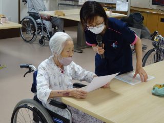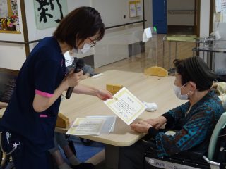 13日は、敬老会のお祝いで賞状とポーチをプレゼントさせていただきました。